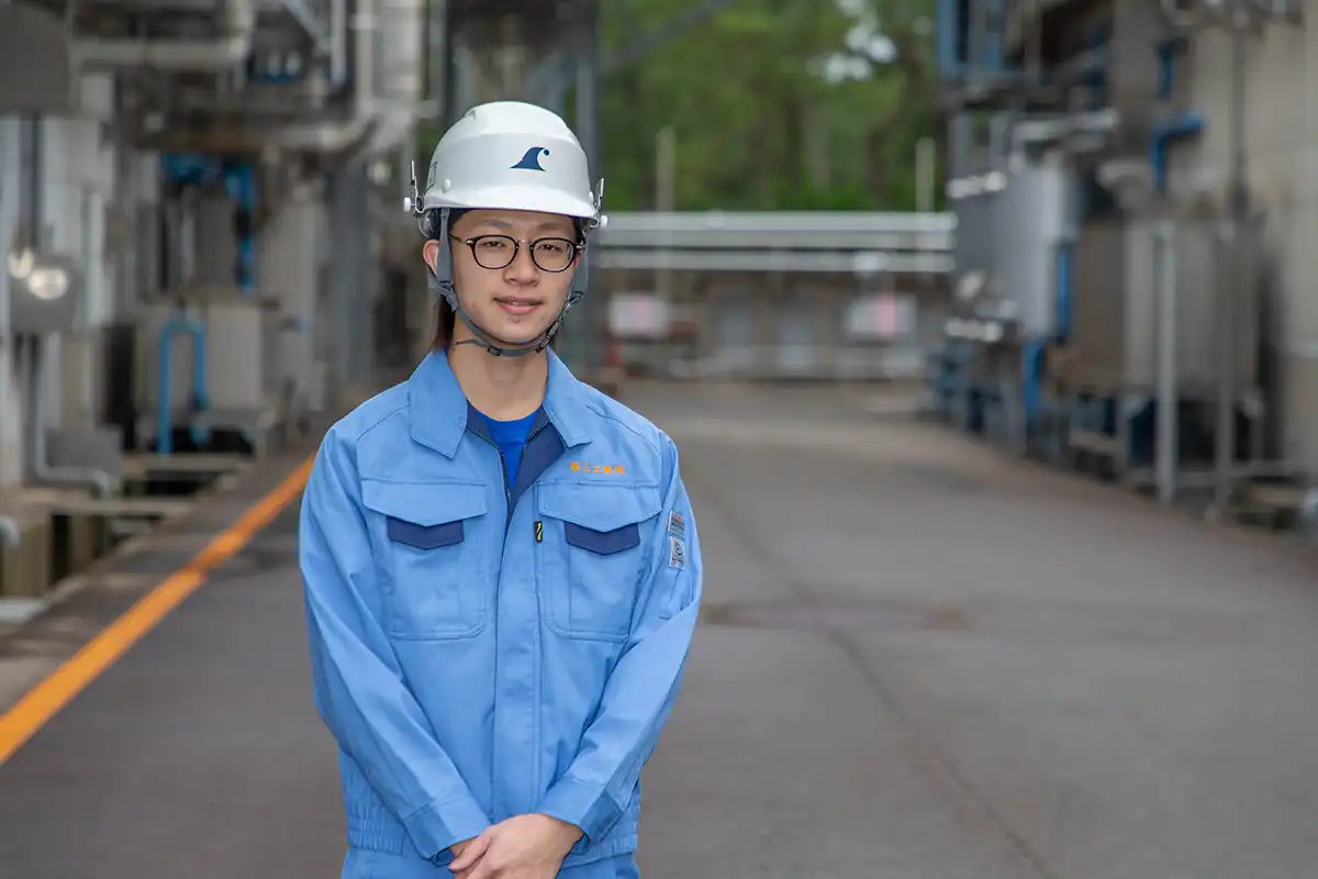 生産のオペレーターです。開発部門が設計したレシピに従って、原料の仕込みから化学反応、出来上がった製品を次のラインに移送するまでを担当しています。一つの作業を延々と歯車のようにやるのではなく、一連の工程すべてに携わります。今は前工程ですが、いずれは後工程もすべてできるようになるつもりです。